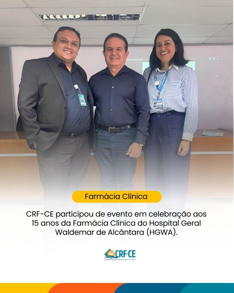 O Conselho Regional de Farmácia do Ceará (CRF-CE) participou, no dia 22 de janeiro de 2026, do evento em celebração aos 15 anos da Farmácia Clínica do Hospital Geral Dr. Waldemar de Alcântara (HGWA), momento marcante para a valorização da atuação farmacêutica hospitalar e do cuidado clínico centrado no paciente.