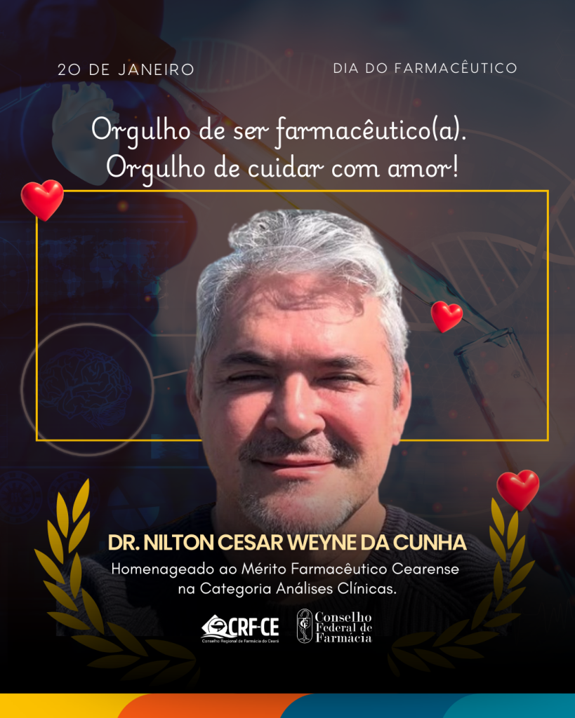 Na Campanha do Dia do Farmacêutico, o CRF-CE homenageia o farmacêutico Dr. Nilton Cesar Weyne da Cunha com o Mérito Farmacêutico Cearense – Categoria Analises Clínicas em reconhecimento à sua dedicação, competência técnica e relevante contribuição à saúde.