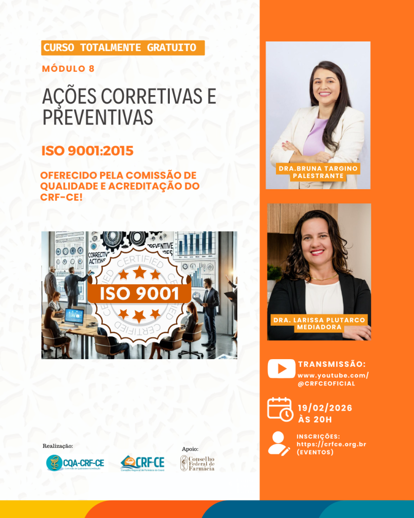 O encontro será realizado no dia 19 de fevereiro de 2026 (quinta-feira), às 20h, com transmissão gratuita pelo canal oficial do CRF-CE no YouTube, ampliando o acesso ao conhecimento e fortalecendo a qualificação profissional na área de gestão da qualidade aplicada aos serviços de saúde.
