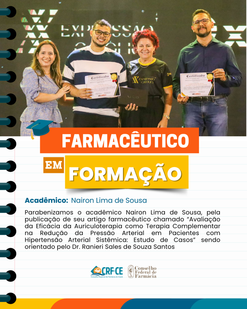 A Diretoria do Conselho Regional de Farmácia do Ceará (CRF-CE), juntamente com Conselheiros Federais e Regionais, parabeniza o acadêmico Nairon Lima de Sousa pela publicação de seu artigo intitulado “Avaliação da Eficácia da Auriculoterapia como Terapia Complementar na Redução da Pressão Arterial em Pacientes com Hipertensão Arterial Sistêmica: Estudo de Casos”, sob orientação do Dr. Ranieri Sales de Sousa.