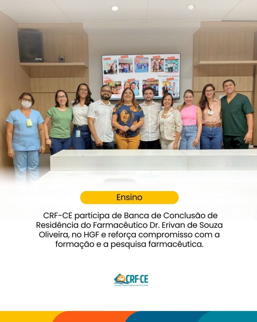 O Conselho Regional de Farmácia do Ceará (CRF-CE) reforça seu compromisso com a valorização da formação acadêmica, da qualificação profissional e do fortalecimento da pesquisa científica ao destacar a participação da Presidente do CRF-CE, Dra. Arlandia Nobre, como orientadora e integrante da banca avaliadora do Trabalho de Conclusão de Residência do farmacêutico Dr. Erivan de Souza Oliveira, realizado no Hospital Geral de Fortaleza (HGF).