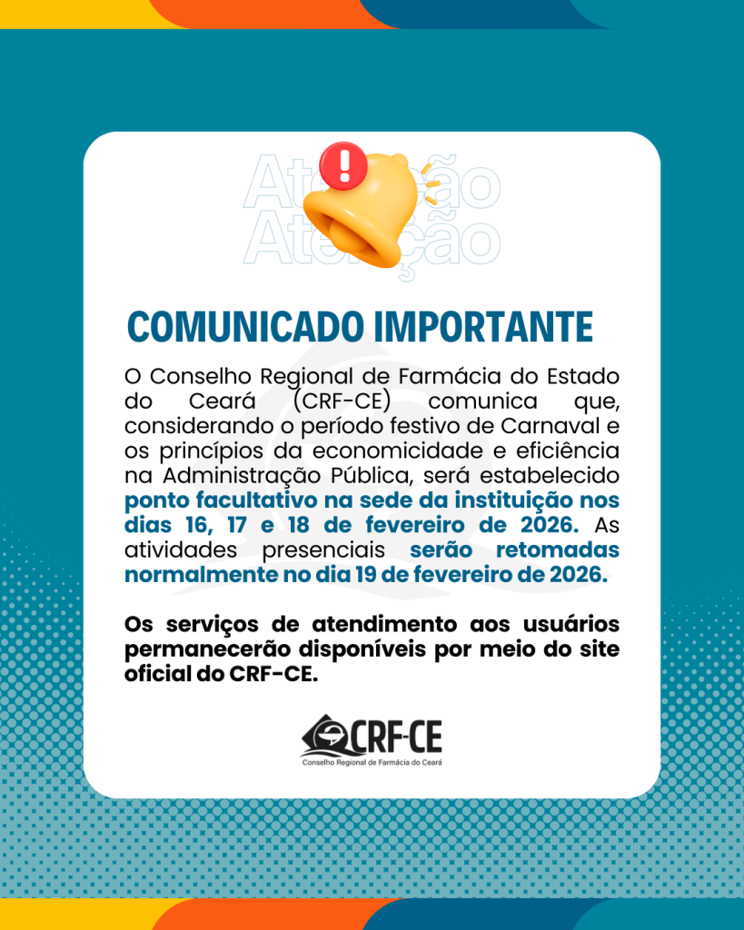 O Conselho Regional de Farmácia do Estado do Ceará (CRF-CE) informa que, em virtude do período de Carnaval, haverá ponto facultativo nos dias 16, 17 e 18 de fevereiro de 2026, na sede da instituição.