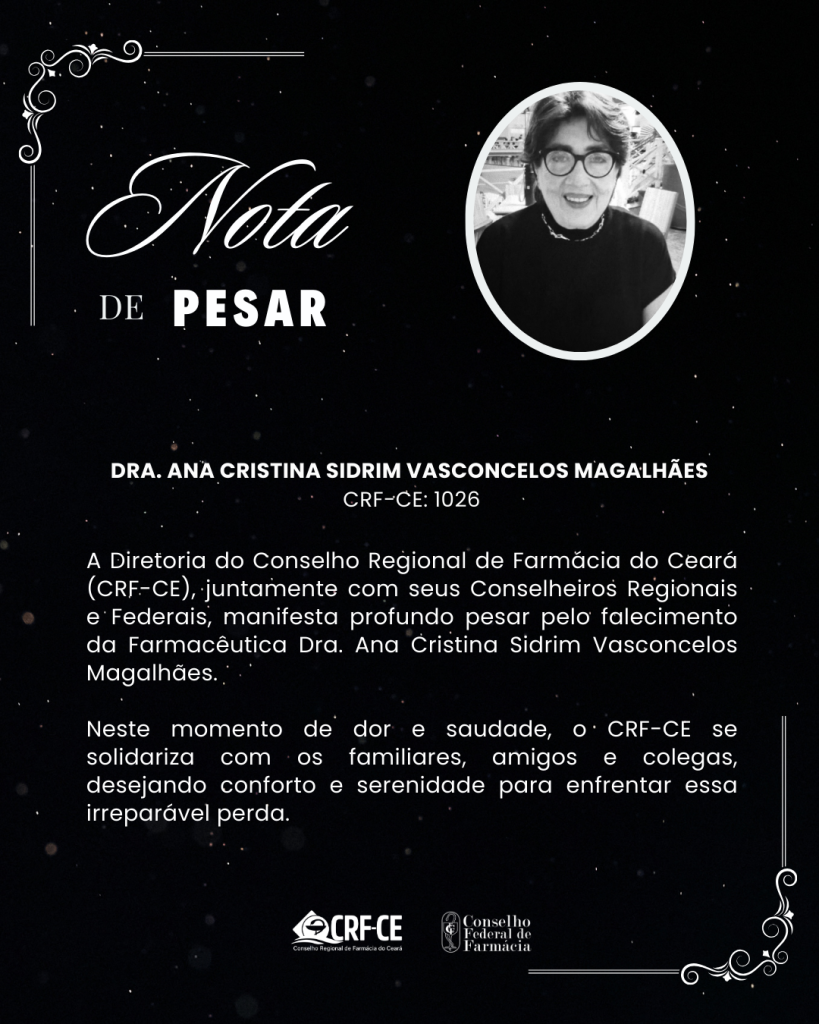 A Diretoria do Conselho Regional de Farmácia do Ceará (CRF-CE), juntamente com seus Conselheiros Regionais e Federais, manifesta profundo pesar pelo falecimento da Farmacêutica Dra. Ana Cristina Sidrim Vasconcelos Magalhães.