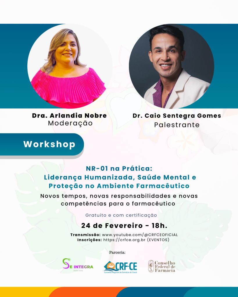 Novos tempos exigem novas responsabilidades e novas competências para o farmacêutico. Pensando nisso, o Conselho Regional de Farmácia do Ceará (CRF-CE) e o Conselho Federal de Farmácia (CFF) promovem em parceria com empresa SE INTEGRA, um workshop essencial para quem deseja se atualizar, fortalecer a liderança e transformar o ambiente de trabalho em um espaço mais humano, saudável e produtivo.