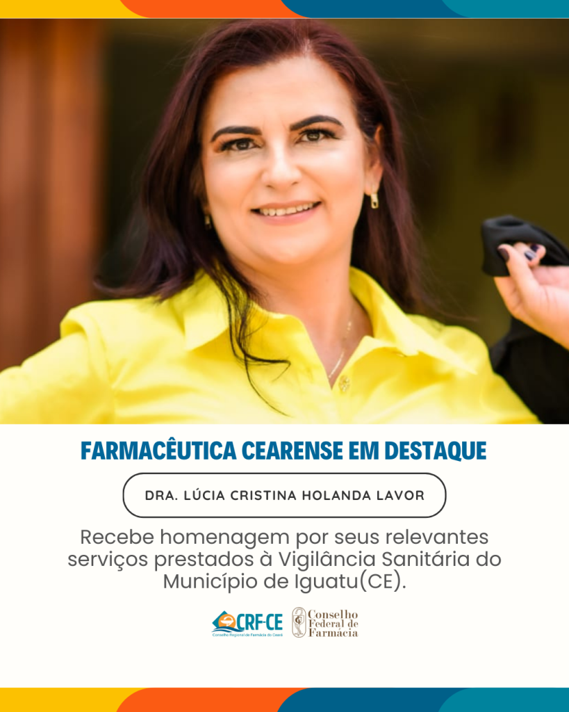 O Conselho Regional de Farmácia do Ceará (CRF-CE), por meio de sua Diretoria, Conselheiros Federais e Conselheiros Regionais, parabeniza a farmacêutica Dra. Lúcia Cristina Holanda Lavor por importante homenagem recebida em reconhecimento à sua trajetória profissional.
