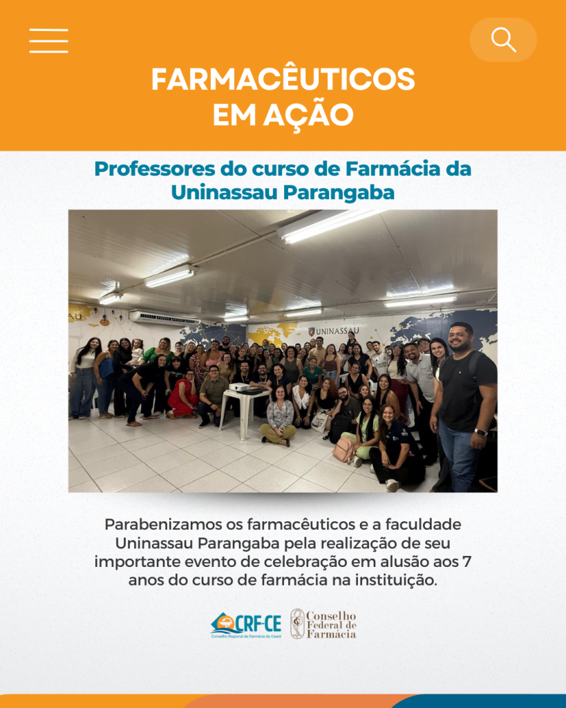 O CRF-CE, junto com os Conselheiros Federais e Regionais, parabenizam os farmacêuticos da Faculdade Uninassau Parangaba, pelo evento “Fuá da Farmácia”.