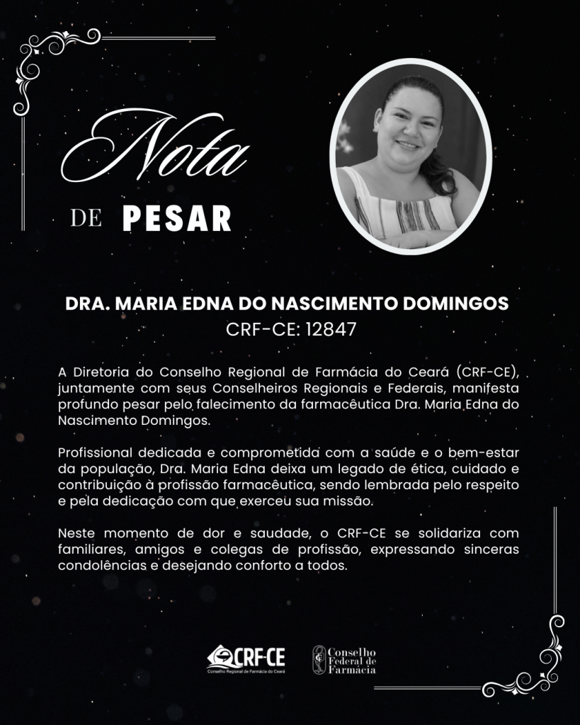 A Diretoria do Conselho Regional de Farmácia do Ceará (CRF-CE), juntamente com seus Conselheiros Regionais e Federais, manifesta profundo pesar pelo falecimento da farmacêutica Dra. Maria Edna do Nascimento Domingos.