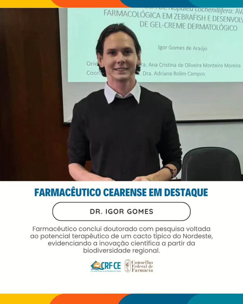 O Conselho Regional de Farmácia do Ceará (CRF-CE), por meio de sua Diretoria, Conselheiros Federais e Conselheiros Regionais, parabeniza o farmacêutico Dr. Igor Gomes por mais uma importante conquista em sua trajetória acadêmica e profissional.