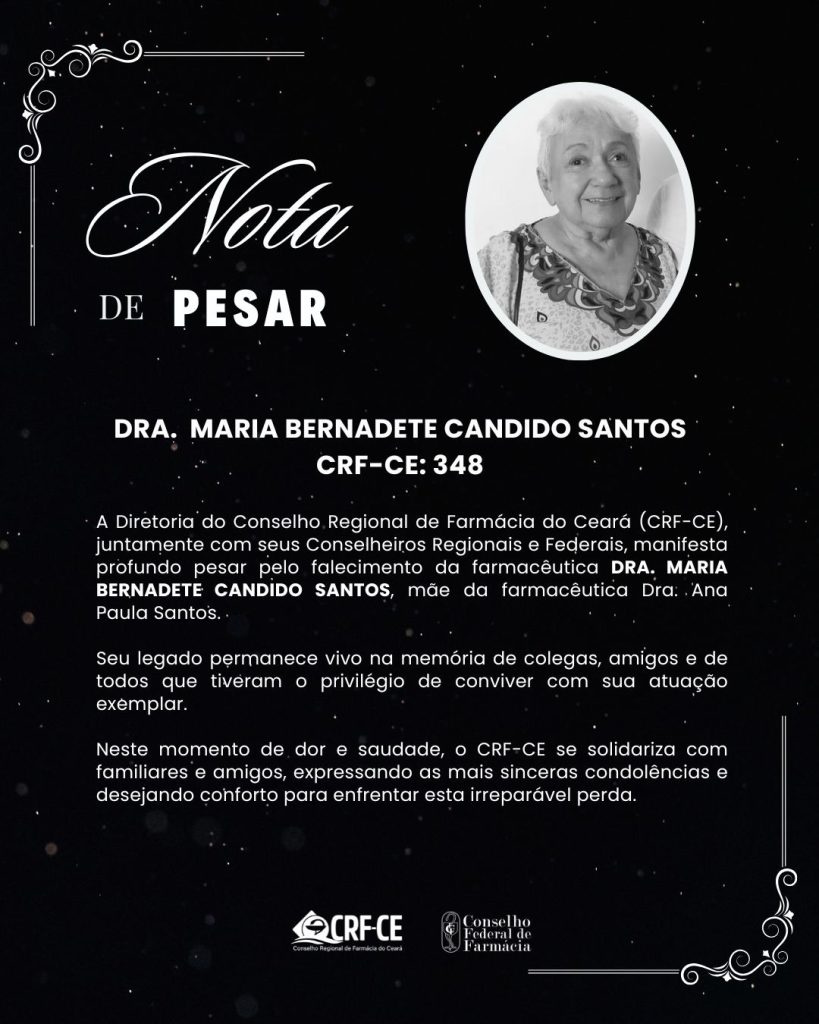 A Diretoria do Conselho Regional de Farmácia do Ceará (CRF-CE), juntamente com seus Conselheiros Regionais e Federais, manifesta profundo pesar pelo falecimento da farmacêutica DRA. MARIA BERNADETE CANDIDO SANTOS, mãe da farmacêutica Dra. Ana Paula Santos.
