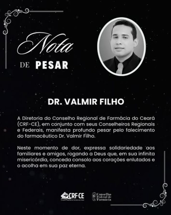 A Diretoria do Conselho Regional de Farmácia do Ceará (CRF-CE), em conjunto com seus Conselheiros Regionais e Federais, manifesta profundo pesar pelo falecimento do farmacêutico Dr. Valmir Filho.